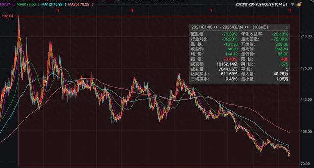 5月29日,洋河股份股价再次显著下跌,盘中一度下探至65元/股,创下2017年5月以来的8年新低。